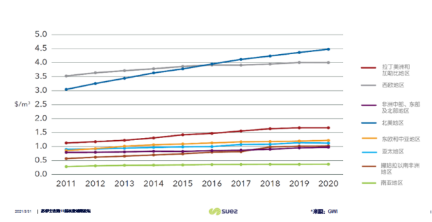 全国水情报的一张图统计了从2011年到2020年全球各地区的供排水价格增长趋势。全球平均水价是2.18美元,北美和欧洲地区的水价明显高于其他地区,相比较而言,我国的水价水平据此还是差距悬殊。当然这也与世界各国的人均GDP等因素相关,不能仅仅简单的做参照。但从实际出发,挖掘和重视水的价值,是一个关键的工作。