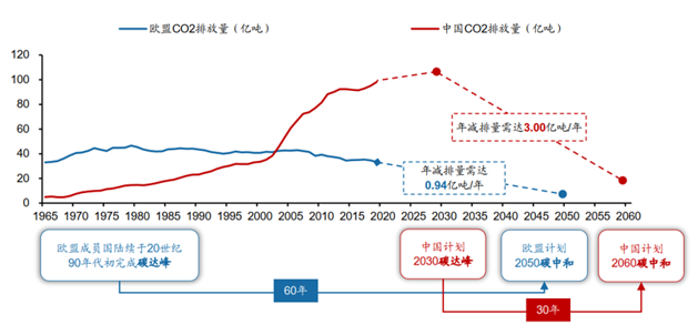 碳达峰、碳中和 “30/60目标”,是另一个举足轻重的时代背景。通过一张图,邵凯向与会者展示了我国与欧盟碳达峰至碳中和所需的时间跨度和年减排量上的巨大差距。