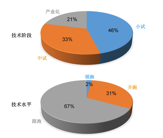 第二个是环境科技成果的产业化水平偏低。从2018年环境领域技术预测研究情况看,我国环境领域关键技术大多处于小试阶段(占46%),中试、产业化发展阶段的比例仅分别为33%、21%。
