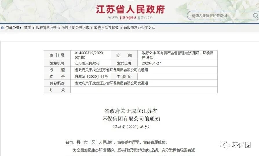 最新一则消息是,4月27日,江苏省人民政府正式印发了关于成立江苏省环保集团有限公司的通知,江苏省环保集团主要由整合省级环保资产,引入央企资本组建而成,注册资本50亿元。(详情点击:定了!江苏环保集团正式成立 长江生态占股20%)