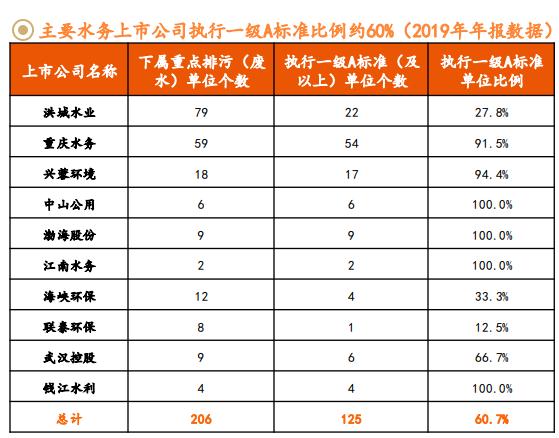 污水处理厂提标改造需求带来广阔市场空间。虽然我国污水处理率已处于较高水平,但出水水质还有待提升。随着我国对环境保护的要求不断提高,越来越多的污水厂排放标准由原来的《城镇污水处理厂污染物排放标准》(GB18918-2002)中的二级、一级 B 标准提升为一级 A 或者更高标准,污水处理厂提标改造迫在眉睫。截止2019年底,我们统计主要上市公司一级A标准执行率约60%,提标改造空间较大。