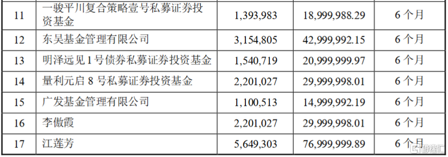 此次发行最终确定发行对象为17家,均在发行人和主承销商发送认购邀请书的特定对象投资者名单之内,本次发行的最终配售结果如下: