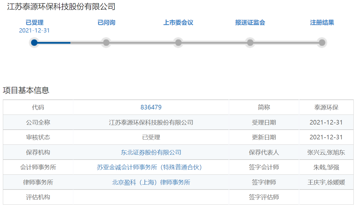 近日,江苏泰源环保科技股份有限公司(下称“泰源环保”)北交所上市申请获受理披露。