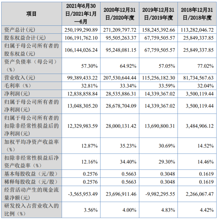 财务数据显示,公司2018年、2019年、2020年、2021年上半年营收分别为8173.45万元、1.15亿元、2.07亿元、9938.94万元;同期对应的净利润分别为3,50.01万元、1433.93万元、2853.58万元、1283.88万元。