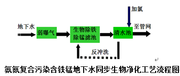 在研发、集成高铁锰复合污染水质高效生物净化滤层技术及高铁锰复合污染水质生物净化工艺快速启动稳定运行技术两项单项技术的基础上,形成氨氮复合污染含铁锰地下水同步生物净化集成技术,达到通过一次生物过滤净化氨氮复合污染含铁锰地下水。