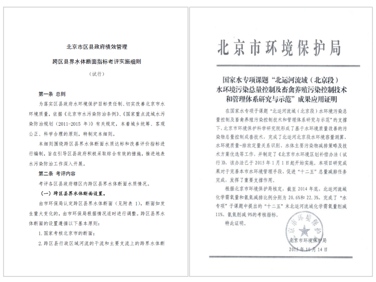2、该成果直接推动了北京市《城镇污水处理厂污染物排放标准》(DB11/890-2012)和《水污染物综合排放标准》(DB11/307-2013)两项最严格地方标准的颁布和实施,实现了控制城镇污水处理厂出水对河道水质的不利影响,完善了北京市水环境管理手段、促进了“十二五”污染总量减排任务完成。