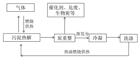 利用污泥炭催化重整污泥热解挥发份,使污泥中所含的热值主要转移到气体中,用气体的燃烧来供应热解系统的能耗,使热解所需干基热值降低到2000Kcal/kg以下;挥发份的清洁化能源利用途径是炭重整、冷凝、洗涤后燃烧,热解油进行回喷燃烧利用;炭的高值化利用途径包括做催化剂、稳定焚烧飞灰和含重金属的危废;纯污水污泥在