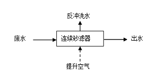 采用一定粒径的石英砂作为过滤介质,依靠过滤截留作用实现废水中有机聚合物颗粒的截留。通过设计,使滤柱内同时实现废水的过滤和滤料的清洗,从而实现连续进水过滤操作。原水加药絮凝后经原水管流进砂滤器底部,在砂滤器底部以环状布水均匀进入,水体向上流动,遇到细小的砂粒阻挡,悬浮物随砂粒下沉,清水通过砂粒缝隙上浮,在砂滤中间部位装有气提管,空压机不断将空气送入气提管中带动管内砂粒上浮,管外的砂粒不断填充气提管带走砂粒的空位,气提管上端外侧安装着自动反冲洗装置,气提管流出的砂粒在下沉过程中受到上流清水的冲洗作用而将悬浮物截留,随冲洗水一同流出池外;砂滤器的上部设有可调节的出水堰板,调节出水水量。